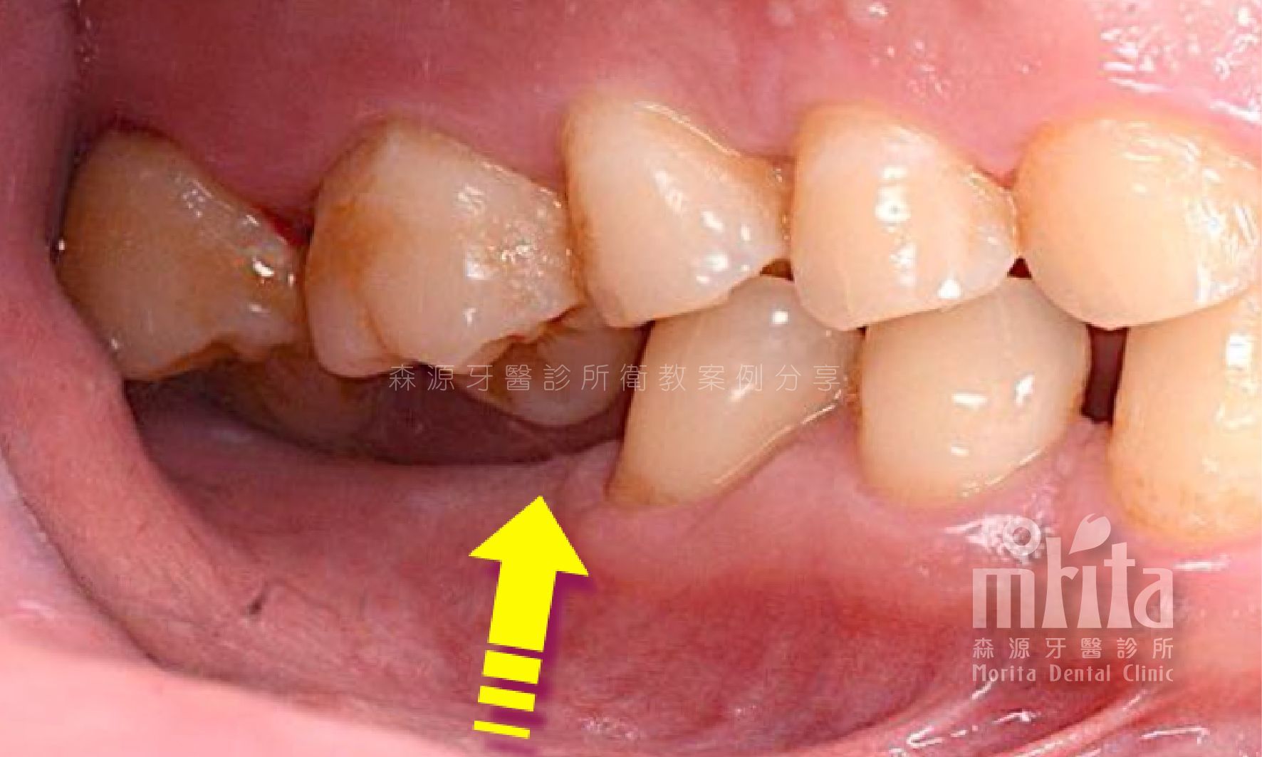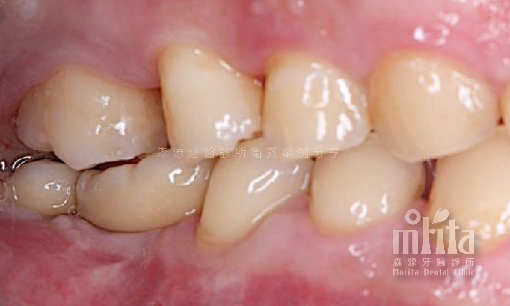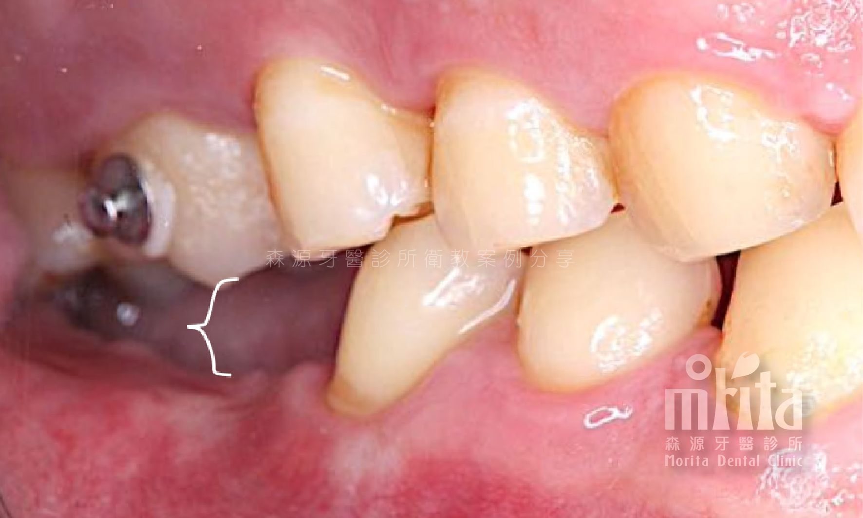 因牙齒被拔掉缺少咬合力,造成對側牙齒慢慢變⻑,甚至快咬到牙床, 藉由局部矯正,將牙齒壓入,才爭取到約3~4mm的空間,可以植牙製作假牙。