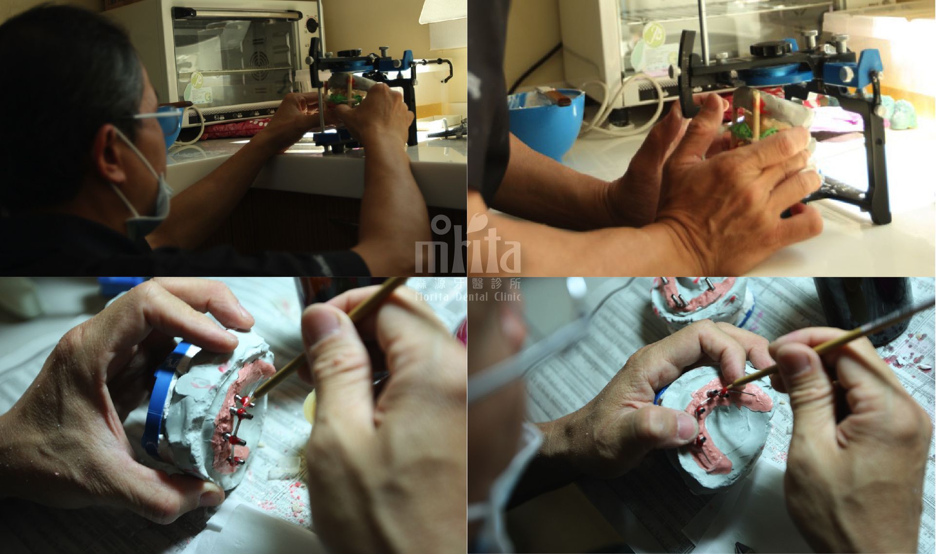 一日假牙除了需要集結手術醫師,假牙醫師,麻醉醫師配合之外,也需要專業的一日假牙資深技師一同合作,在治療中的特定階段馬上在在診所同步進行假牙的製作。
